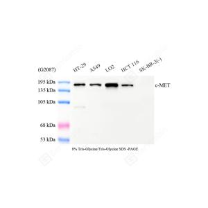 | WB检测Met (c-Met)蛋白(货号 GB150172) . 样品: 经RIPA裂解液(货号G2002)处理的蛋白质. 封闭: 3%脱脂牛奶(货号GC310001)溶于TBST溶液, 室温孵育1小时. —抗: 1: 500稀释, 4℃ 孵育过夜. 二抗: HRP标记山羊抗兔IgG (H+L) (货号GB23303), 1: 5000稀释, 室温孵育1小时. |