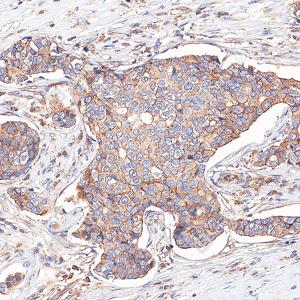 | IHC检测Met (c-Met)蛋白(货号 GB150172). 样品: 人乳腺癌, 4%多聚甲醛 (货号G1101) 固定12-24小时. 抗原修复: 抗原修复仪(货号 ARI-4), Tris-EDTA抗原修复液(pH 9.0) (货号G1203), 水浴100℃, 25分钟. —抗: 1: 1800稀释, 4℃ 孵育过夜. 二抗: S-vision免疫组化多聚二抗(山羊抗兔),即用型 (货号G1302), 室温孵育20分钟. |