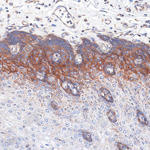 | IHC检测Met (c-Met)蛋白(货号 GB150172). 样品: 人食管, 4%多聚甲醛 (货号G1101) 固定12-24小时. 抗原修复: 抗原修复仪(货号 ARI-4), Tris-EDTA抗原修复液(pH 9.0) (货号G1203), 水浴100℃, 25分钟. —抗: 1: 1800稀释, 4℃ 孵育过夜. 二抗: S-vision免疫组化多聚二抗(山羊抗兔),即用型 (货号G1302), 室温孵育20分钟. |