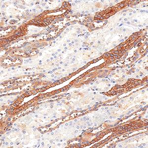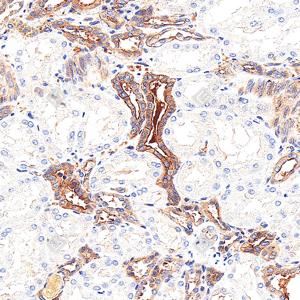| IHC检测Met (c-Met)蛋白(货号 GB150172). 样品: 人肾, 4%多聚甲醛 (货号G1101) 固定12-24小时. 抗原修复: 抗原修复仪(货号 ARI-4), Tris-EDTA抗原修复液(pH 9.0) (货号G1203), 水浴100℃, 25分钟. —抗: 1: 1800稀释, 4℃ 孵育过夜. 二抗: S-vision免疫组化多聚二抗(山羊抗兔),即用型 (货号G1302), 室温孵育20分钟. |