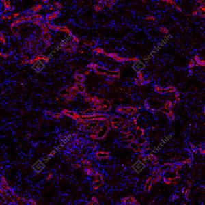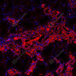 | IF检测Met (c-Met)蛋白(货号 GB150172)(红色). 样品: 人肾, 4%多聚甲醛 (货号G1101) 固定12-24小时. 抗原修复: 抗原修复仪(货号 ARI-4), Tris-EDTA抗原修复液(pH 9.0) (货号G1203), 水浴100℃, 25分钟. 封闭: 3% BSA(货号GC305010)的PBS溶液, 室温孵育30分钟. —抗: 1: 1500稀释, 4℃ 孵育过夜. 二抗: Cy3标记山羊抗兔IgG (H+L) (货号GB21303), 1: 300稀释, 室温孵育1小时. |