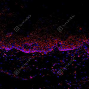 | IF检测Met (c-Met)蛋白(货号 GB150172)(红色). 样品: 人食管, 4%多聚甲醛 (货号G1101) 固定12-24小时. 抗原修复: 抗原修复仪(货号 ARI-4), Tris-EDTA抗原修复液(pH 9.0) (货号G1203), 水浴100℃, 25分钟. 封闭: 3% BSA(货号GC305010)的PBS溶液, 室温孵育30分钟. —抗: 1: 1000稀释, 4℃ 孵育过夜. 二抗: Cy3标记山羊抗兔IgG (H+L) (货号GB21303), 1: 300稀释, 室温孵育1小时. |