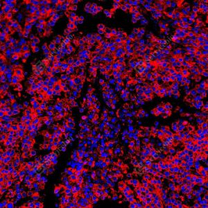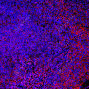 | IF检测Met (c-Met)蛋白(货号 GB150172)(红色). 样品: 人扁桃体, 4%多聚甲醛 (货号G1101) 固定12-24小时. 抗原修复: 抗原修复仪(货号 ARI-4), Tris-EDTA抗原修复液(pH 9.0) (货号G1203), 水浴100℃, 25分钟. 封闭: 3% BSA(货号GC305010)的PBS溶液, 室温孵育30分钟. —抗: 1: 1000稀释, 4℃ 孵育过夜. 二抗: Cy3标记山羊抗兔IgG (H+L) (货号GB21303), 1: 300稀释, 室温孵育1小时. |