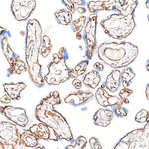 | IHC检测Laminin beta 1蛋白(货号 GB15408). 样品: 小鼠胎盘, 4%多聚甲醛 (货号G1101) 固定12-24小时. 抗原修复: 抗原修复仪 (货号 ARI-4),Tris-EDTA抗原修复液(pH 9.0) (货号G1203), 高压锅均匀喷气计时2分钟. —抗: 1: 1000稀释, 4℃ 孵育过夜. 二抗: S-vision免疫组化多聚二抗(山羊抗小鼠), 即用型(货号G1301), 室温孵育20分钟. |