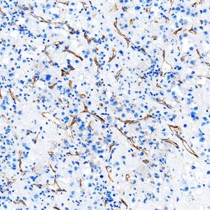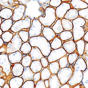 | IHC检测Laminin beta 1蛋白(货号 GB15408). 样品: 人肾癌, 4%多聚甲醛 (货号G1101) 固定12-24小时. 抗原修复: 抗原修复仪 (货号 ARI-4),Tris-EDTA抗原修复液(pH 9.0) (货号G1203), 高压锅均匀喷气计时2分钟. —抗: 1: 1000稀释, 4℃ 孵育过夜. 二抗: S-vision免疫组化多聚二抗(山羊抗小鼠), 即用型(货号G1301), 室温孵育20分钟. |