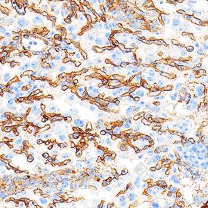 | IHC检测Laminin beta 1蛋白(货号 GB15408). 样品: 人胎盘, 4%多聚甲醛 (货号G1101) 固定12-24小时. 抗原修复: 抗原修复仪 (货号 ARI-4),Tris-EDTA抗原修复液(pH 9.0) (货号G1203), 高压锅均匀喷气计时2分钟. —抗: 1: 1000稀释, 4℃ 孵育过夜. 二抗: S-vision免疫组化多聚二抗(山羊抗小鼠), 即用型(货号G1301), 室温孵育20分钟. |