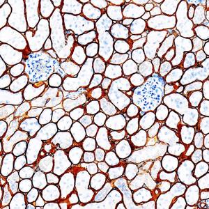 | IHC检测Laminin beta 1蛋白(货号 GB15408). 样品: 大鼠肾, 4%多聚甲醛 (货号G1101) 固定12-24小时. 抗原修复: 抗原修复仪 (货号 ARI-4),Tris-EDTA抗原修复液(pH 9.0) (货号G1203), 高压锅均匀喷气计时2分钟. —抗: 1: 1000稀释, 4℃ 孵育过夜. 二抗: S-vision免疫组化多聚二抗(山羊抗小鼠), 即用型(货号G1301), 室温孵育20分钟. |