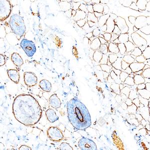 | IHC检测Laminin beta 1蛋白(货号 GB15408). 样品: 大鼠皮肤, 4%多聚甲醛 (货号G1101) 固定12-24小时. 抗原修复: 抗原修复仪 (货号 ARI-4),Tris-EDTA抗原修复液(pH 9.0) (货号G1203), 高压锅均匀喷气计时2分钟. —抗: 1: 1000稀释, 4℃ 孵育过夜. 二抗: S-vision免疫组化多聚二抗(山羊抗小鼠), 即用型(货号G1301), 室温孵育20分钟. |