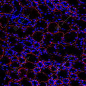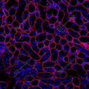 | IF检测Laminin beta 1蛋白(货号 GB15408)(红色). 样品: 大鼠肾, 4%多聚甲醛 (货号G1101) 固定12-24小时. 抗原修复: 抗原修复仪 (货号 ARI-4),Tris-EDTA抗原修复液(pH 9.0) (货号G1203), 高压锅均匀喷气计时2分钟. 封闭: 3% BSA(货号GC305010)的PBS溶液, 室温孵育30分钟. —抗: 1: 1000稀释, 4℃ 孵育过夜. 二抗: Cy3标记山羊抗小鼠IgG (H+L) (货号GB21301), 1: 300稀释, 室温孵育1小时. |