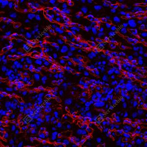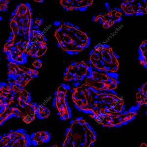 | IF检测Laminin beta 1蛋白(货号 GB15408)(红色). 样品: 人胎盘, 4%多聚甲醛 (货号G1101) 固定12-24小时. 抗原修复: 抗原修复仪 (货号 ARI-4),Tris-EDTA抗原修复液(pH 9.0) (货号G1203), 高压锅均匀喷气计时2分钟. 封闭: 3% BSA(货号GC305010)的PBS溶液, 室温孵育30分钟. —抗: 1: 1000稀释, 4℃ 孵育过夜. 二抗: Cy3标记山羊抗小鼠IgG (H+L) (货号GB21301), 1: 300稀释, 室温孵育1小时. |
