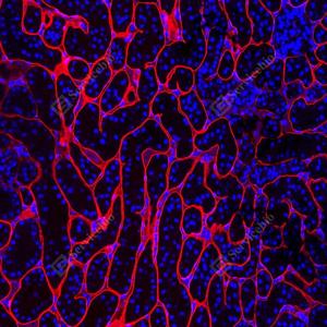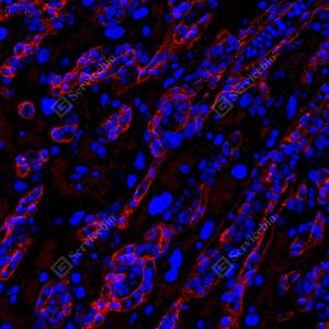| IF检测Laminin beta 1蛋白(货号 GB15408)(红色). 样品: 人肾, 4%多聚甲醛 (货号G1101) 固定12-24小时. 抗原修复: 抗原修复仪 (货号 ARI-4),Tris-EDTA抗原修复液(pH 9.0) (货号G1203), 高压锅均匀喷气计时2分钟. 封闭: 3% BSA(货号GC305010)的PBS溶液, 室温孵育30分钟. —抗: 1: 1000稀释, 4℃ 孵育过夜. 二抗: Cy3标记山羊抗小鼠IgG (H+L) (货号GB21301), 1: 300稀释, 室温孵育1小时. |