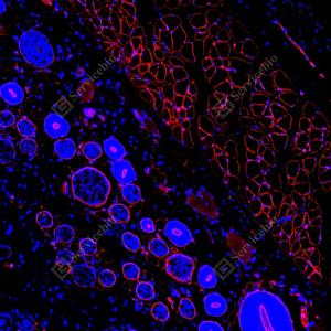 | IF检测Laminin beta 1蛋白(货号 GB15408)(红色). 样品: 大鼠皮肤, 4%多聚甲醛 (货号G1101) 固定12-24小时. 抗原修复: 抗原修复仪 (货号 ARI-4),Tris-EDTA抗原修复液(pH 9.0) (货号G1203), 高压锅均匀喷气计时2分钟. 封闭: 3% BSA(货号GC305010)的PBS溶液, 室温孵育30分钟. —抗: 1: 1000稀释, 4℃ 孵育过夜. 二抗: Cy3标记山羊抗小鼠IgG (H+L) (货号GB21301), 1: 300稀释, 室温孵育1小时. |