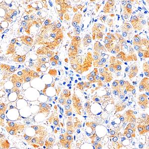 | IHC检测Transferrin蛋白(货号 GB15637). 样品: 人肝癌, 4%多聚甲醛 (货号G1101) 固定12-24小时. 抗原修复: 柠檬酸抗原修复液(干粉, pH 6.0) (G1201), 高压锅均匀喷气计时2分钟. —抗: 1: 1000稀释, 4℃ 孵育过夜. 二抗: S-vision免疫组化多聚二抗(山羊抗兔),即用型 (货号G1302), 室温孵育20分钟. |