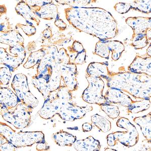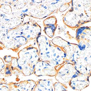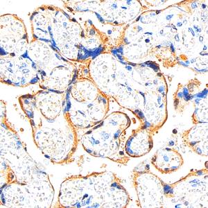 | IHC检测Transferrin蛋白(货号 GB15637). 样品: 人胎盘, 4%多聚甲醛 (货号G1101) 固定12-24小时. 抗原修复: 柠檬酸抗原修复液(干粉, pH 6.0) (G1201), 高压锅均匀喷气计时2分钟. —抗: 1: 1000稀释, 4℃ 孵育过夜. 二抗: S-vision免疫组化多聚二抗(山羊抗兔),即用型 (货号G1302), 室温孵育20分钟. |