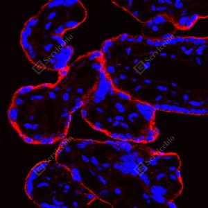 | IF检测Transferrin蛋白(货号 GB15637)(红色). 样品: 人胎盘, 4%多聚甲醛 (货号G1101) 固定12-24小时. 抗原修复: 柠檬酸抗原修复液(干粉, pH 6.0) (G1201), 高压锅均匀喷气计时2分钟. 封闭: 3% BSA(货号GC305010)的PBS溶液, 室温孵育30分钟. —抗: 1: 1000稀释, 4℃ 孵育过夜. 二抗: Cy3标记山羊抗兔IgG (H+L) (货号GB21303), 1: 300稀释, 室温孵育1小时. |