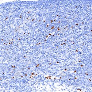 | IHC检测SOX10蛋白(货号 GB15782). 样品: 小鼠脾, 4%多聚甲醛 (货号G1101) 固定12-24小时. 抗原修复: 抗原修复仪(货号 ARI-4),Tris-EDTA抗原修复液(pH 9.0) (货号G1203), 水浴100℃, 25分钟. —抗: 1: 2000稀释, 4℃ 孵育过夜. 二抗: S-vision免疫组化多聚二抗(山羊抗兔),即用型 (货号G1302), 室温孵育20分钟. |