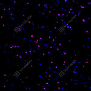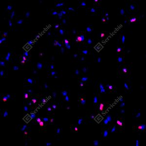 | IF检测SOX10蛋白(货号 GB15782)(红色). 样品: 大鼠胚胎, 4%多聚甲醛 (货号G1101) 固定12-24小时. 抗原修复: 抗原修复仪(货号 ARI-4),Tris-EDTA抗原修复液(pH 9.0) (货号G1203), 水浴100℃, 25分钟. 封闭: 3% BSA(货号GC305010)的PBS溶液, 室温孵育30分钟. —抗: 1: 2000稀释, 4℃ 孵育过夜. 二抗: Cy3标记山羊抗兔IgG (H+L) (货号GB21303), 1: 300稀释, 室温孵育1小时. |