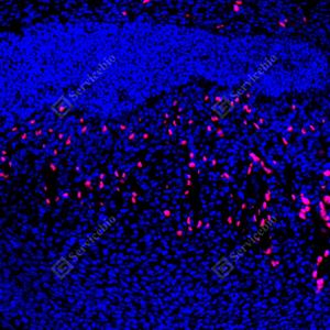 | IF检测SOX10蛋白(货号 GB15782)(红色). 样品: 小鼠脑, 4%多聚甲醛 (货号G1101) 固定12-24小时. 抗原修复: 抗原修复仪(货号 ARI-4),Tris-EDTA抗原修复液(pH 9.0) (货号G1203), 水浴100℃, 25分钟. 封闭: 3% BSA(货号GC305010)的PBS溶液, 室温孵育30分钟. —抗: 1: 2000稀释, 4℃ 孵育过夜. 二抗: Cy3标记山羊抗兔IgG (H+L) (货号GB21303), 1: 300稀释, 室温孵育1小时. |