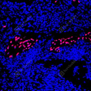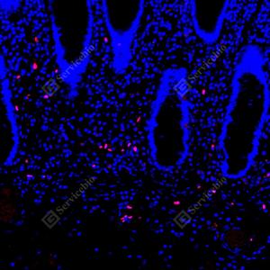 | IF检测SOX10蛋白(货号 GB15782)(红色). 样品: 人结肠, 4%多聚甲醛 (货号G1101) 固定12-24小时. 抗原修复: 抗原修复仪(货号 ARI-4),Tris-EDTA抗原修复液(pH 9.0) (货号G1203), 水浴100℃, 25分钟. 封闭: 3% BSA(货号GC305010)的PBS溶液, 室温孵育30分钟. —抗: 1: 2000稀释, 4℃ 孵育过夜. 二抗: Cy3标记山羊抗兔IgG (H+L) (货号GB21303), 1: 300稀释, 室温孵育1小时. |