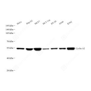 Cyclin A2 belongs to the highly conserved cyclin family, whose members are characterized by a dramatic periodicity in protein abundance through the cell cycle. Cyclins function as regulators of CDK kinases. Different cyclins exhibit distinct expression and degradation patterns which contribute to the temporal coordination of each mitotic event. In contrast to cyclin A1, which is present only in germ cells, this cyclin is expressed in all tissues tested. Cyclin A2 binds and activates CDC2 or CDK2 kinases, and thus promotes both cell cycle G1/S and G2/M transitions. Cyclin A2 could be phosphorylated during the G2/M.
