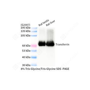 | WB检测Transferrin蛋白(货号 GB150148). 样品: 经RIPA裂解液(货号G2002)处理的蛋白质. 封闭: 3%脱脂牛奶(货号GC310001)溶于TBST溶液, 室温孵育1小时. —抗: 1: 1000稀释, 4℃ 孵育过夜. 二抗: HRP标记山羊抗小鼠IgG (H+L) (货号GB23301), 1: 5000稀释, 室温孵育1小时. |