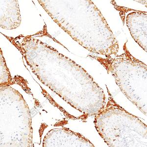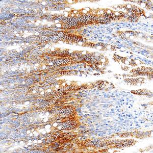 | IHC检测Transferrin蛋白(货号 GB150148). 样品: 大鼠结肠, 4%多聚甲醛 (货号G1101) 固定12-24小时. 抗原修复: 抗原修复仪 (货号 ARI-4),柠檬酸抗原修复液(干粉, pH 60) (G1201), 高压锅均匀喷气计时2分钟. —抗: 1: 1000稀释, 4℃ 孵育过夜. 二抗: S-vision免疫组化多聚二抗(山羊抗小鼠), 即用型(货号G1301), 室温孵育20分钟. |