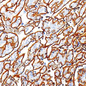 | IHC检测Transferrin蛋白(货号 GB150148). 样品: 大鼠胎盘, 4%多聚甲醛 (货号G1101) 固定12-24小时. 抗原修复: 抗原修复仪 (货号 ARI-4),柠檬酸抗原修复液(干粉, pH 60) (G1201), 高压锅均匀喷气计时2分钟. —抗: 1: 1000稀释, 4℃ 孵育过夜. 二抗: S-vision免疫组化多聚二抗(山羊抗小鼠), 即用型(货号G1301), 室温孵育20分钟. |