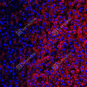 | IF检测Transferrin蛋白(货号 GB150148)(红色). 样品: 大鼠肝, 4%多聚甲醛 (货号G1101) 固定12-24小时. 抗原修复: 抗原修复仪 (货号 ARI-4),柠檬酸抗原修复液(干粉, pH 60) (G1201), 高压锅均匀喷气计时2分钟. 封闭: 3% BSA(货号GC305010)的PBS溶液, 室温孵育30分钟. —抗: 1: 1000稀释, 4℃ 孵育过夜. 二抗: Cy3标记山羊抗小鼠IgG (H+L) (货号GB21301), 1: 300稀释, 室温孵育1小时. |
