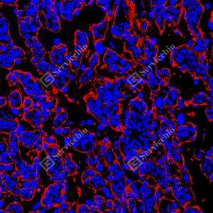 | IF检测Transferrin蛋白(货号 GB150148)(红色). 样品: 大鼠胎盘, 4%多聚甲醛 (货号G1101) 固定12-24小时. 抗原修复: 抗原修复仪 (货号 ARI-4),柠檬酸抗原修复液(干粉, pH 60) (G1201), 高压锅均匀喷气计时2分钟. 封闭: 3% BSA(货号GC305010)的PBS溶液, 室温孵育30分钟. —抗: 1: 1000稀释, 4℃ 孵育过夜. 二抗: Cy3标记山羊抗小鼠IgG (H+L) (货号GB21301), 1: 300稀释, 室温孵育1小时. |