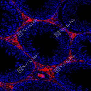 | IF检测Transferrin蛋白(货号 GB150148)(红色). 样品: 大鼠睾丸, 4%多聚甲醛 (货号G1101) 固定12-24小时. 抗原修复: 抗原修复仪 (货号 ARI-4),柠檬酸抗原修复液(干粉, pH 60) (G1201), 高压锅均匀喷气计时2分钟. 封闭: 3% BSA(货号GC305010)的PBS溶液, 室温孵育30分钟. —抗: 1: 1000稀释, 4℃ 孵育过夜. 二抗: Cy3标记山羊抗小鼠IgG (H+L) (货号GB21301), 1: 300稀释, 室温孵育1小时. |