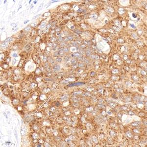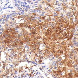IHC检测Hsp27蛋白(货号 GB151176). 样品: 人肺角化性鳞状细胞癌, 4%多聚甲醛 (货号G1101) 固定12-24小时. 抗原修复: 柠檬酸抗原修复液(干粉, pH 6.0) (G1201), 高压锅均匀喷气计时2分钟. —抗: 1: 1000稀释, 4℃ 孵育过夜. 二抗: HRP标记山羊抗小鼠IgG (H+L) (货号GB23301), 1: 200稀释, 室温孵育1小时. |