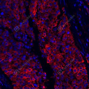 IF检测Hsp27蛋白(货号 GB151176)(红色). 样品: 人宫颈癌, 4%多聚甲醛 (货号G1101) 固定12-24小时. 抗原修复: 柠檬酸抗原修复液(干粉, pH 6.0) (G1201), 高压锅均匀喷气计时2分钟. 封闭: 3% BSA(货号GC305010)的PBS溶液, 室温孵育30分钟. —抗: 1: 500稀释, 4℃ 孵育过夜. 二抗: Cy3标记山羊抗小鼠IgG (H+L) (货号GB21301), 1: 300稀释, 室温孵育1小时. |