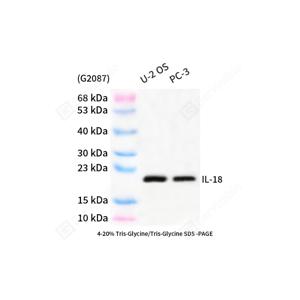 | WB检测IL-18蛋白(货号 GB155632) . 样品: 经RIPA裂解液(货号G2002)处理的蛋白质. 封闭: 3%脱脂牛奶(货号GC310001)溶于TBST溶液, 室温孵育1小时. —抗: 1: 500稀释, 4℃ 孵育过夜. 二抗: HRP标记山羊抗小鼠IgG (H+L) (货号GB23301), 1: 5000稀释, 室温孵育1小时. |