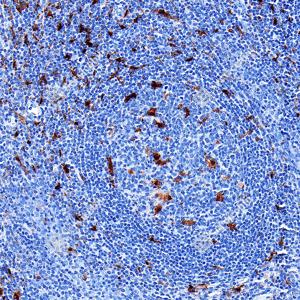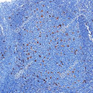 | IHC检测IL-18蛋白(货号 GB155632). 样品: 人扁桃体, 4%多聚甲醛 (货号G1101) 固定12-24小时. 抗原修复: 抗原修复仪(货号 ARI-4), Tris-EDTA抗原修复液(pH 9.0) (货号G1203), 水浴100℃, 25分钟. —抗: 1: 1000稀释, 4℃ 孵育过夜. 二抗: S-vision免疫组化多聚二抗(山羊抗小鼠), 即用型(货号G1301), 室温孵育20分钟. |