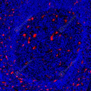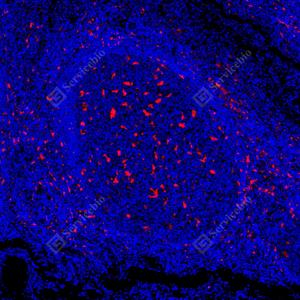 | IF检测IL-18蛋白(货号 GB155632)(红色). 样品: 人扁桃体, 4%多聚甲醛 (货号G1101) 固定12-24小时. 抗原修复: 抗原修复仪(货号 ARI-4), Tris-EDTA抗原修复液(pH 9.0) (货号G1203), 水浴100℃, 25分钟. 封闭: 3% BSA(货号GC305010)的PBS溶液, 室温孵育30分钟. —抗: 1: 1000稀释, 4℃ 孵育过夜. 二抗: Cy3标记山羊抗小鼠IgG (H+L) (货号GB21301), 1: 300稀释, 室温孵育1小时. |
