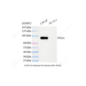WB检测PSMA蛋白(货号 GB155710). 样品: 经RIPA裂解液(货号G2002)处理的蛋白质. 封闭: 3%脱脂牛奶(货号GC310001)溶于TBST溶液, 室温孵育1小时. —抗: 1: 1000稀释, 4℃ 孵育过夜. 二抗: HRP标记山羊抗小鼠IgG (H+L) (货号GB23301), 1: 5000稀释, 室温孵育1小时. |