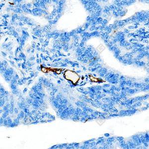 IHC检测PSMA蛋白(货号 GB155710). 样品: 人子宫内膜癌, 4%多聚甲醛 (货号G1101) 固定12-24小时. 抗原修复: 柠檬酸抗原修复液 (干粉, pH 6.0) (G1201), 高压锅均匀喷气计时2分钟. —抗: 1: 800稀释, 4℃ 孵育过夜. 二抗: S-vision免疫组化多聚二抗(山羊抗小鼠), 即用型(货号G1301), 室温孵育20分钟. |