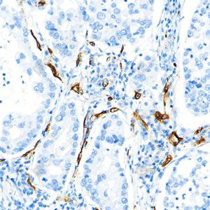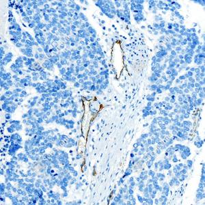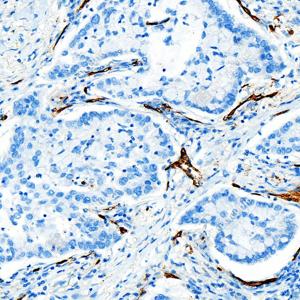 IHC检测 PSMA蛋白(货号 GB155710). 样品: 人肺癌, 4%多聚甲醛 (货号G1101) 固定12-24小时. 抗原修复: 柠檬酸抗原修复液 (干粉, pH 6.0) (G1201), 高压锅均匀喷气计时2分钟. —抗: 1: 800稀释, 4℃ 孵育过夜. 二抗: S-vision免疫组化多聚二抗(山羊抗小鼠), 即用型(货号G1301), 室温孵育20分钟. |