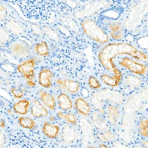 IHC检测PSMA蛋白(货号 GB155710). 样品: 人肾, 4%多聚甲醛 (货号G1101) 固定12-24小时. 抗原修复: 柠檬酸抗原修复液 (干粉, pH 6.0) (G1201), 高压锅均匀喷气计时2分钟. —抗: 1: 800稀释, 4℃ 孵育过夜. 二抗: S-vision免疫组化多聚二抗(山羊抗小鼠), 即用型(货号G1301), 室温孵育20分钟. |