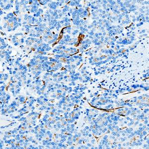 IHC检测PSMA蛋白(货号 GB155710). 样品: 人肝癌, 4%多聚甲醛 (货号G1101) 固定12-24小时. 抗原修复: 柠檬酸抗原修复液 (干粉, pH 6.0) (G1201), 高压锅均匀喷气计时2分钟. —抗: 1: 800稀释, 4℃ 孵育过夜. 二抗: S-vision免疫组化多聚二抗(山羊抗小鼠), 即用型(货号G1301), 室温孵育20分钟. |