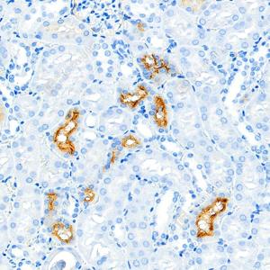 IHC检测 PSMA蛋白(货号 GB155710). 样品: 小鼠肾, 4%多聚甲醛 (货号G1101) 固定12-24小时. 抗原修复: 柠檬酸抗原修复液 (干粉, pH 6.0) (G1201), 高压锅均匀喷气计时2分钟. —抗: 1: 800稀释, 4℃ 孵育过夜. 二抗: S-vision免疫组化多聚二抗(山羊抗小鼠), 即用型(货号G1301), 室温孵育20分钟. |