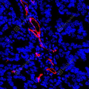 IF检测 PSMA蛋白(货号 GB155710)(红色). 样品: 人子宫内膜癌, 4%多聚甲醛 (货号G1101) 固定12-24小时. 抗原修复: 柠檬酸抗原修复液 (干粉, pH 6.0) (G1201), 高压锅均匀喷气计时2分钟. —抗: 1: 800稀释, 4℃ 孵育过夜. 二抗: Cy3标记山羊抗小鼠IgG (H+L) (货号GB21301), 1: 300稀释, 室温孵育1小时. |