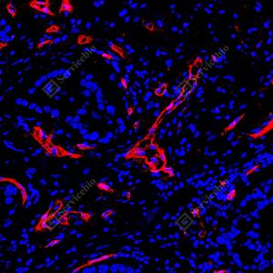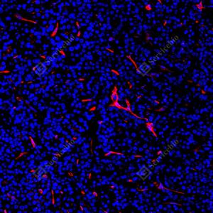 IF检测PSMA蛋白(货号 GB155710)(红色). 样品: 人肺癌, 4%多聚甲醛 (货号G1101) 固定12-24小时. 抗原修复: 柠檬酸抗原修复液 (干粉, pH 6.0) (G1201), 高压锅均匀喷气计时2分钟. —抗: 1: 800稀释, 4℃ 孵育过夜. 二抗: Cy3标记山羊抗小鼠IgG (H+L) (货号GB21301), 1: 300稀释, 室温孵育1小时. |