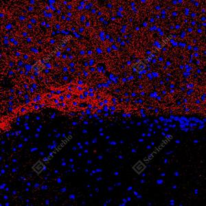 | IF检测Acetylcholinesterase蛋白(货号 GB150188)(红色). 样品: 小鼠脑, 4%多聚甲醛 (货号G1101) 固定12-24小时. 抗原修复: 抗原修复仪(货号 ARI-4),Tris-EDTA抗原修复液(pH 9.0) (货号G1203), 水浴100℃, 25分钟. 封闭: 3% BSA(货号GC305010)的PBS溶液, 室温孵育30分钟. —抗: 1: 1000稀释, 4℃ 孵育过夜. 二抗: Cy3标记山羊抗兔IgG (H+L) (货号GB21303), 1: 300稀释, 室温孵育1小时. |