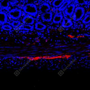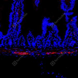| IF检测Acetylcholinesterase蛋白(货号 GB150188)(红色). 样品: 小鼠小肠, 4%多聚甲醛 (货号G1101) 固定12-24小时. 抗原修复: 抗原修复仪(货号 ARI-4),Tris-EDTA抗原修复液(pH 9.0) (货号G1203), 水浴100℃, 25分钟. 封闭: 3% BSA(货号GC305010)的PBS溶液, 室温孵育30分钟. —抗: 1: 1000稀释, 4℃ 孵育过夜. 二抗: Cy3标记山羊抗兔IgG (H+L) (货号GB21303), 1: 300稀释, 室温孵育1小时. |