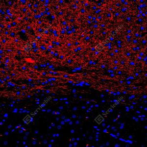 | IF检测Acetylcholinesterase蛋白(货号 GB150188)(红色). 样品: 大鼠脑, 4%多聚甲醛 (货号G1101) 固定12-24小时. 抗原修复: 抗原修复仪(货号 ARI-4),Tris-EDTA抗原修复液(pH 9.0) (货号G1203), 水浴100℃, 25分钟. 封闭: 3% BSA(货号GC305010)的PBS溶液, 室温孵育30分钟. —抗: 1: 1000稀释, 4℃ 孵育过夜. 二抗: Cy3标记山羊抗兔IgG (H+L) (货号GB21303), 1: 300稀释, 室温孵育1小时. |