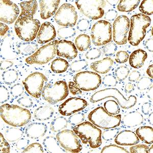 IHC检测AMACR蛋白(货号 GB151195). 样品: 人肾, 4%多聚甲醛 (货号G1101) 固定12-24小时. 抗原修复: 柠檬酸抗原修复液(干粉, pH 6.0) (G1201), 高压锅均匀喷气计时2分钟. —抗: 1: 1000稀释, 4℃ 孵育过夜. 二抗: S-vision免疫组化多聚二抗(山羊抗小鼠), 即用型(货号G1301), 室温孵育20分钟. |