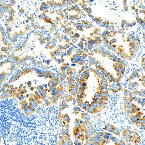 IHC检测AMACR蛋白(货号 GB151195). 样品: 人肺癌, 4%多聚甲醛 (货号G1101) 固定12-24小时. 抗原修复: 柠檬酸抗原修复液(干粉, pH 6.0) (G1201), 高压锅均匀喷气计时2分钟. —抗: 1: 1000稀释, 4℃ 孵育过夜. 二抗: S-vision免疫组化多聚二抗(山羊抗小鼠), 即用型(货号G1301), 室温孵育20分钟. |