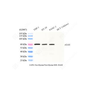 | WB检测cGAS蛋白(货号 GB150090). 样品: 经RIPA裂解液(货号G2002)处理的蛋白质. 封闭: 3%脱脂牛奶(货号GC310001)溶于TBST溶液, 室温孵育1小时. —抗: 1: 1000稀释, 4℃ 孵育过夜. 二抗: HRP标记山羊抗兔IgG (H+L) (货号GB23303), 1: 5000稀释, 室温孵育1小时. |