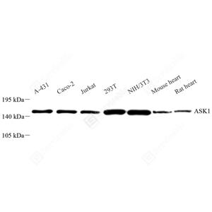 WB检测ASK1蛋白(货号 GB115481). 样品: 经RIPA裂解液(货号G2002)处理的蛋白质. 封闭: 3%脱脂牛奶(货号GC310001)溶于TBST溶液, 室温孵育1小时. —抗: 1: 1000稀释, 4℃ 孵育过夜. 二抗: HRP标记山羊抗兔IgG (H+L) (货号GB23303), 1: 5000稀释, 室温孵育1小时. |